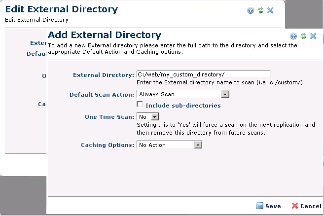 Note: If you specify c:/web/web-app/ and that directory contains another /admin/ directory (c:/web/web-app/admin), the admin directory will not replicate unless you check Include sub-directories for the subsite. In addition, for replication to complete, External Directories must have the same drive and directory structure on the target server(s) as on the authoring server.