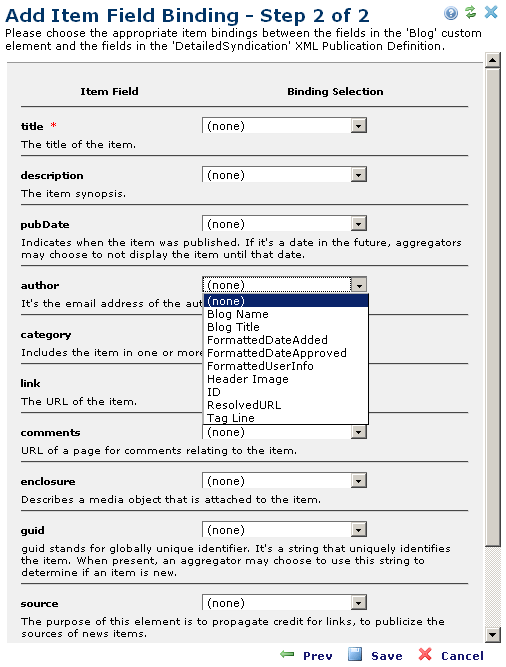 You are here: Administrators Reference > Site Administration > XML Publication > Item Field Bindings > Add Item Field Binding - Step 2 of 2