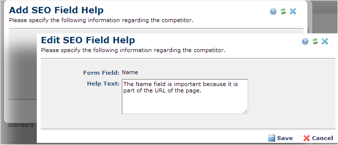 Access this dialog from the SEO Field Help dialog to edit context-sensitive Help text for fields in the Standard Properties, Create New Page, or Rename Page dialogs.