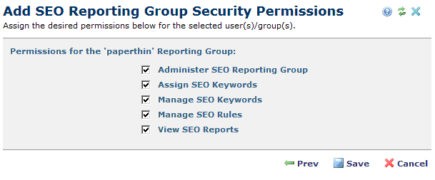 View SEO Reports: View SEO rankings and reports for this reporting group. Checking this option does not automatically grant any other rights.