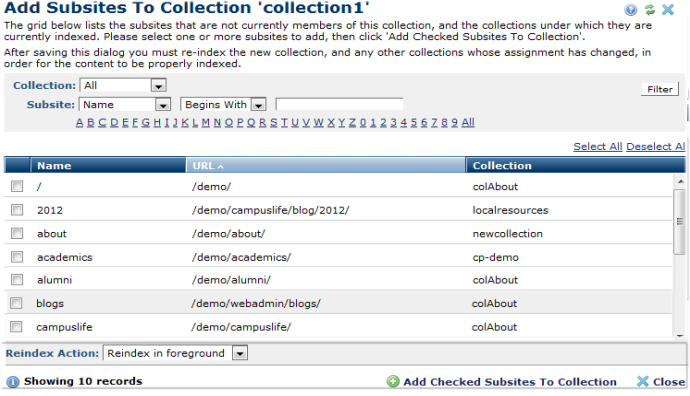 You are here: Administrators Reference > Site Administration > Site Search > Manage Full-Text Search Collections > Add Subsites to Collection