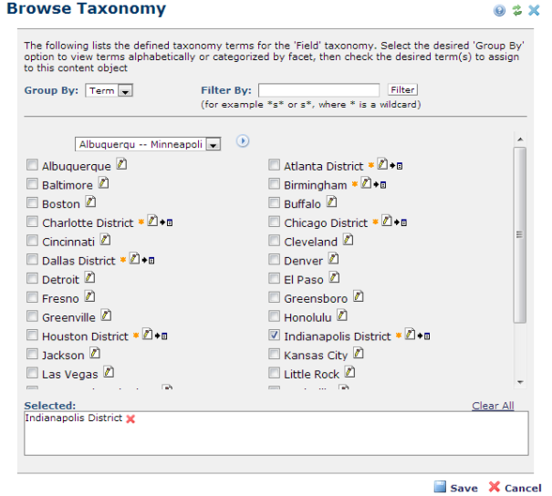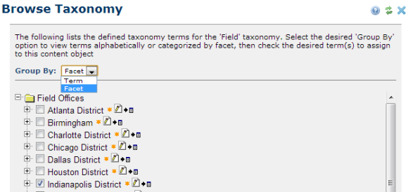 Use the Browse Taxonomy dialog to review terms, term relationships, current data associations, and annotations for an individual taxonomy. Filter by term, facet, or search terms. You can conveniently select terms and maintain your selections while browsing for additional terms.
