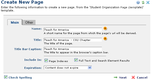 Use this tab to define how the Create New Page dialog displays for your site's content contributors. You can specify which fields are required, whether contributors must enter unique text for the browser Caption Bar, page Description, or Page Title fields, and whether to show, hide, or require fields in the Main tab or the Other tab of the Create New Page dialog.