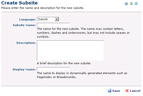 Click Save to add the new subsite to your site, or Cancel to exit without creating.