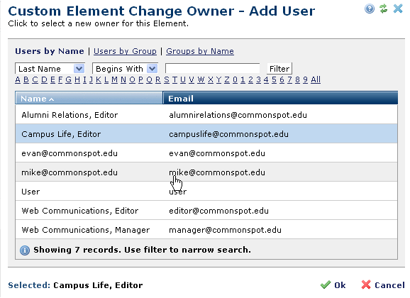 Use the Change Owner or Custom Element Change Owner dialog to reset rights to an individual Element. Element owners assign and remove user and group access and permissions.