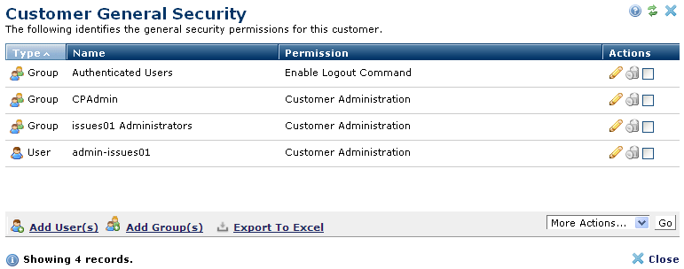 Displays the Customer General Security - Add Users dialog in edit mode to view or change permissions for this group or individual. |