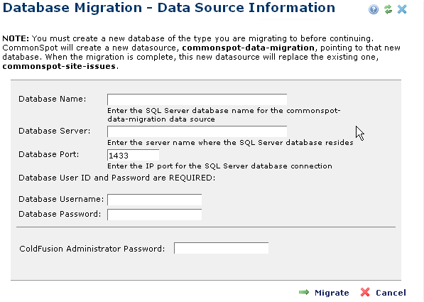 ColdFusion Administrator Password: Required. Enter the password for the instance of ColdFusion supporting CommonSpot on the target server.
