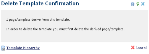You cannot delete templates with active dependencies, as shown above. Click Template Hierarchy (this is discussed in the CommonSpot Content Contributors Reference) to view a list of these dependencies. Once you remove either affected pages and templates or remove dependencies, return to delete the selected template.