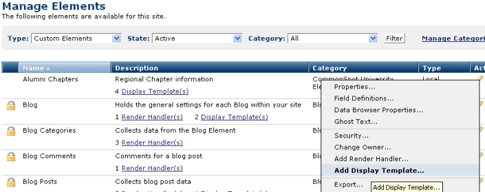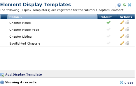 To add a new display template click the edit icon for a Custom Element and select Add Display Template. To view or edit an existing display template, click the associated Display Template(s) link in the Description column for a Custom Element.