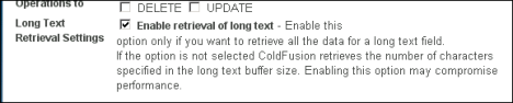 All CommonSpot content is saved in, and retrieved from, the content database. The Rich Text Editor allows contributors to save unusually large volumes of text in a single field, which can compromise performance and may result in CommonSpot truncating text from the bottom of a Rich Text Block. This data isn't lost, but is not fully retrieved from the database. To ensure that long text is not truncated upon retrieval from the database, go to the ColdFusion Administrator. Under CF Settings, find the section Long Text Retrieval Settings, shown below (may also be CLOB). Check the box labeled Enable retrieval of long text for each content database connection.