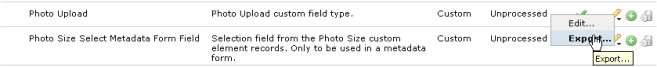 for Manage Elements, Metadata Forms, or Field Types and Masks, displays an export option as shown below, for exportable objects.