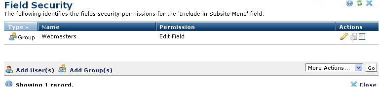 The image above shows the Field Security with edit rights assigned to the Webmasters group for the current field. By default all users have view and edit permissions, unless explicitly changed.
