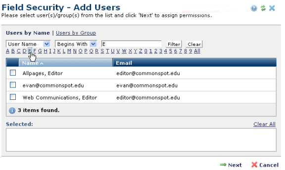 to remove individual users, as shown below, or click Clear All to deselect all users. When you are finished, click Add Selected if you're updating a group, or click Next to complete any required security assignments.