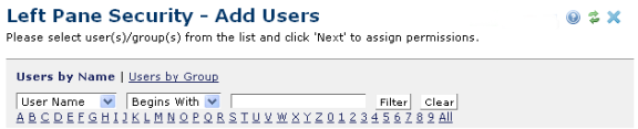 Click Add User(s) or Add Group(s) in the Left Pane Security dialog to set security for individual CommonSpot left panels.