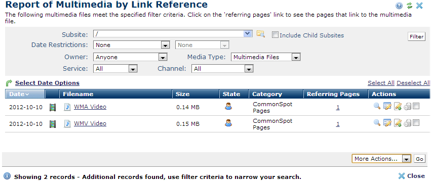 You are here: Administrators Reference > Subsite Administration > Reports > Report of Multimedia Files by Link Reference