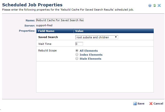 for a job in Site, Server, or Customer Scheduled Jobs or clicking Next in the process of adding the Rebuild Cache for Saved Search Results scheduled job displays properties for this job. This job must reference an existing saved search for which you have rights. See Saved Searches Security in the Contributor's Reference for information on sharing saved searches.