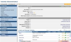 The Subsite Administration dashboard controls content, template, page, and subsite creation options for individual subsites.