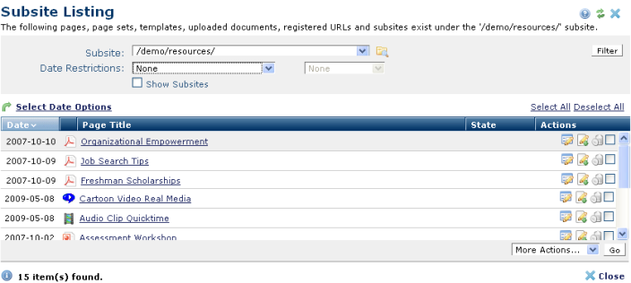 More Actions: Click one or more checkboxes, or Select/Deselect All, pick the appropriate option from the dropdown, and click Go to copy, move, or delete pages or files, or to change owner. You can also selectively delete individual pages by clicking the delete icon