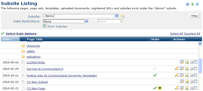 Use this dialog to conveniently view or navigate to pages and subsites from the current subsite. Access this dialog by clicking the directory icon