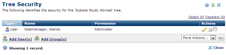 Click the edit icon to view or modify security settings for an existing user or group, or click Add User(s) or Add Group(s) to grant access to this tree to additional users or groups.
