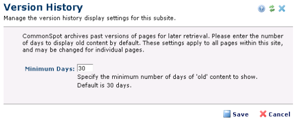 CommonSpot administrators set the default period for viewing old content through this dialog; the initial default is 30 days. These settings apply to all pages within the current subsite and can be changed at the individual page level.