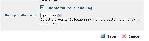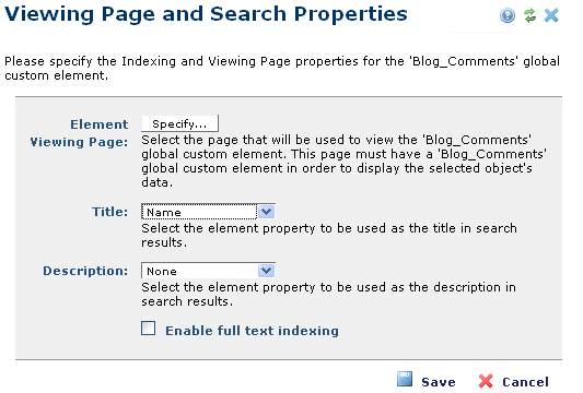 Note: The Title, Description and Enable full text indexing fields display only if you are currently using a search engine. If you are not using a search engine at your site, only the Element Viewing Page field displays.