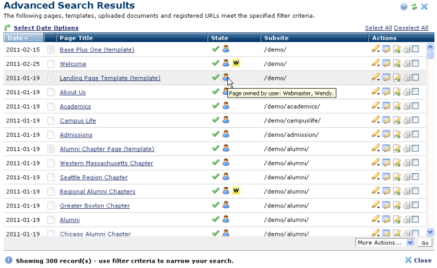 The State column indicates status for each page in this report. A green check mark indicates currently active pages. This column also includes user or group ownership status (where applicable). Mouseover to view owner details. State also displays standard CommonSpot Work In Progress and Approval Icons. A page may display one or more of the following: