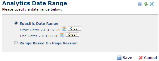 Use this dialog to select a reporting period for Analytics reports. You can use the calendar to set start and end dates, or use the period between two versions of the current page, to conveniently evaluate the results of page changes without researching change dates.