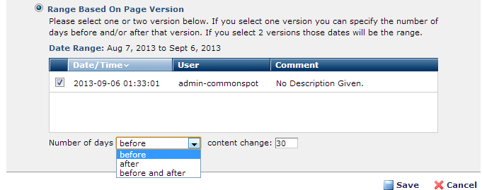 Range Based On Page Version: Selecting this option displays available versions of the page. Set a date range between two versions, or select a version, then specify the number of days before and/or after that version to define the reporting period.