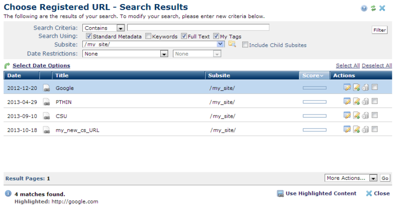 This dialog displays for all operations that allow you to select a URL registered in CommonSpot, for example, inserting or editing a link. You can apply filters to further refine results and modify or delete the registered URLs that display.