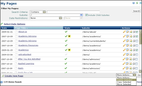 You are here: Contributors Reference > CommonSpot Menus > Actions Menu > Delete Page > Deleting Multiple Pages