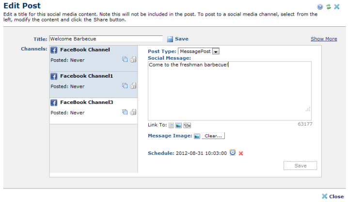 Social Message - Required if you selected MessagePost for the Post Type. Enter or change text content here. CommonSpot updates character count for both Facebook and Twitter messages. Optional for Facebook image messages with text.
