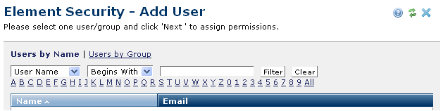 Use the links at the top to optionally view Users by Name, Users by Group, Groups by Name, or Groups by User. Note that not all of these options may display.