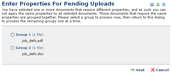 This dialog displays when you select Enter Properties for a multi-file upload with mixed file types in My Pending Uploaded Documents. This dialog does not display when you are uploading multiple files of the same type.