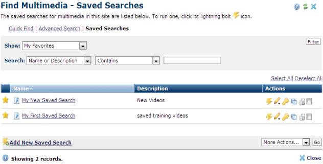 Access this dialog by choosing Saved Search from the Create Saved Search dialog or by selecting the Saved Searches option from Choose or Find Multimedia.