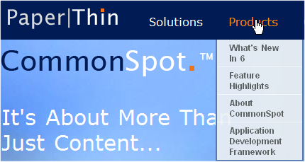Use the pop-up menu function to create JavaScript pop-up style DHTML menus that become visible on mouseover or other cursor action, as shown below for the highlighted Products menu.