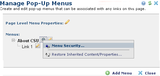 While you can define pop-up menus for individual pages, it’s best to define them at the template level and to “lock down” security by setting Inheritance Security to disallow changes at the page level.