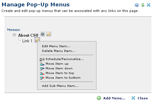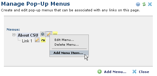 Add Menu - To create a new pop-up menu, click the Add Menu link to open the Start New Pop-Up Menu dialog, for naming the menu and defining its size and pop-up position. Once a menu is created, it displays as a root-level entry in the tree representation of the pop-up menus that have been defined for the page, as shown above for About CSU.