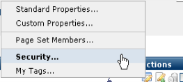 When necessary, you can set Page Set security exceptions to those assigned at the site or subsite level. Custom permissions supersede other assignments. Access this dialog in author mode for existing page sets from My Content - My Page Sets. Select Security from the Metadata & Security icon menu as shown below to customize page set permissions.