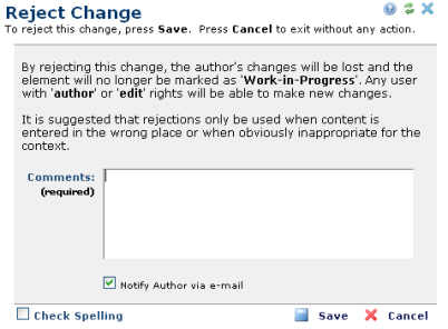 Note: The Reject option can be disabled in the CommonSpot Administrator so that it is not available to approvers.