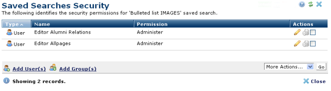 Click the edit icon to modify security settings for existing users, or click Add User(s) or Add Group(s) to share this saved search with other contributors and set security permissions.