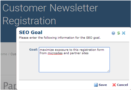 This dialog links from the SEO left pane at the page level to collect and provide information on the SEO goals for the current page.