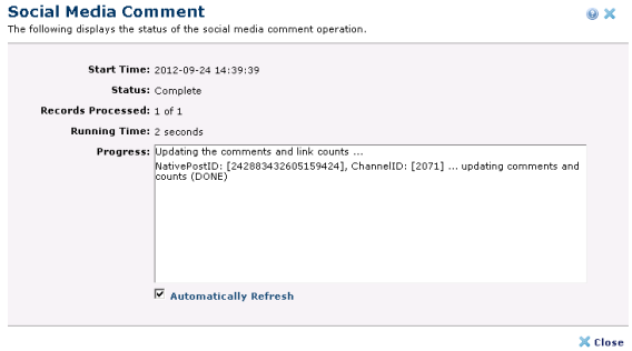 CommonSpot pulls comments and link counts for tweets and facebook shares from external Social Media sites at posting time or through the social media scheduled job. This dialog reports posting status for individual Facebook or Twitter comments generated from Add Post Comment.