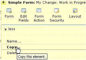 Note: Changes to existing Simple Form fields do not require approval; additions, deletions, and changes automatically appear in the “Read Mode” version of the page. Copying Simple Form Elements using the page-level Copy option from the Element tool dropdown as shown below maintains "source" data in the copy, as long as fields or field definitions remain unchanged.