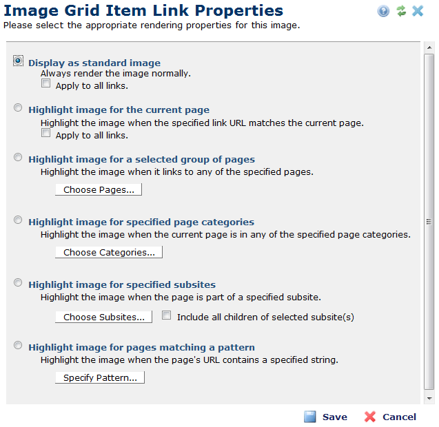 The Link Properties dialog defines how CommonSpot highlights the image grid.