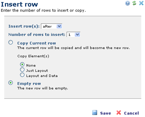 To insert a row, click the Insert/Copy Row(s) menu item to display the Insert Row dialog. The way in which you insert a row is similar to the way in which you insert a column.