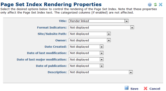 Select the Custom via parameters option from the Page Set Index Layout Properties dialog. This rendering dialog gives you the ability to control how CommonSpot presents Page Set Index links.