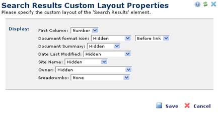 The Search Results Custom Layout Properties dialog allows the content contributor to specify the positioning of the various sub-Elements of the search results.