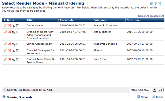 This dialog displays when you choose to manually select existing records (content reuse) for Element output. Access this dialog from Render Properties and use it to build a list and set display order for the records you want shown on the page.