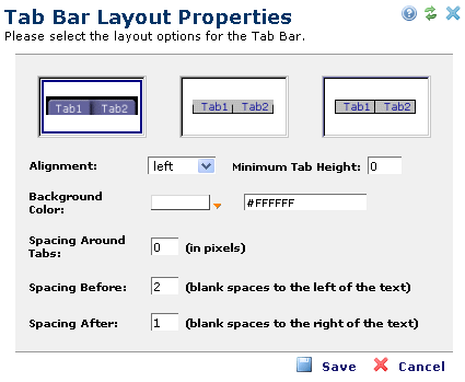 After selecting Tab Bar from the Link & List Elements section of the Element Gallery dialog, click the Element Tool icon and select “Layout” to open the Tab Bar Layout Properties dialog. CommonSpot offers three different tab designs. Choose a layout by clicking a thumbnail image.